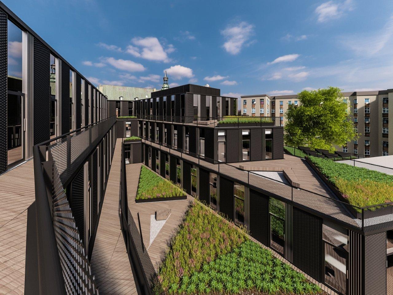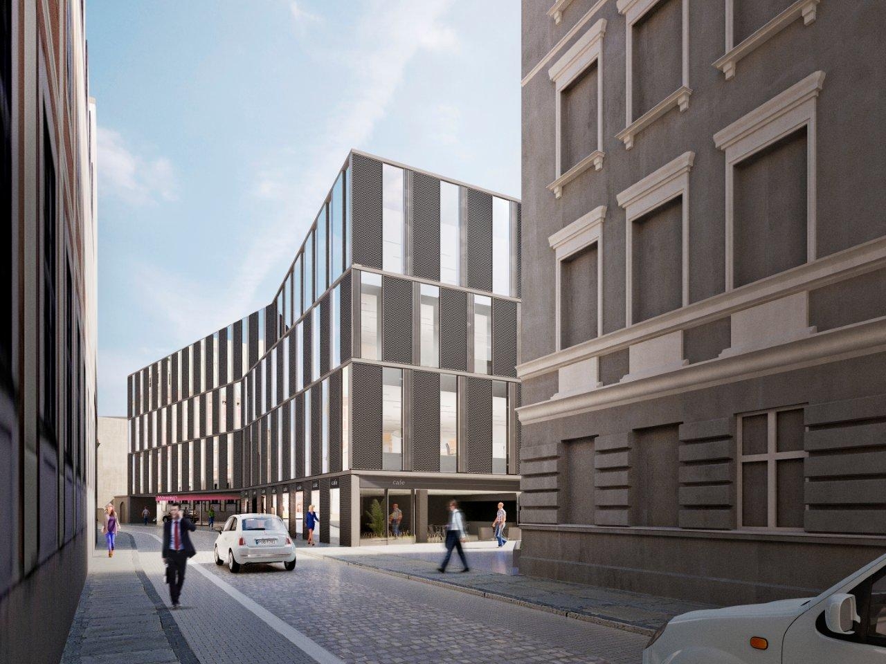 czterokondygnacyjna bryła usługowo‑biurowa wpisana w zabytkowy obszar Poznania